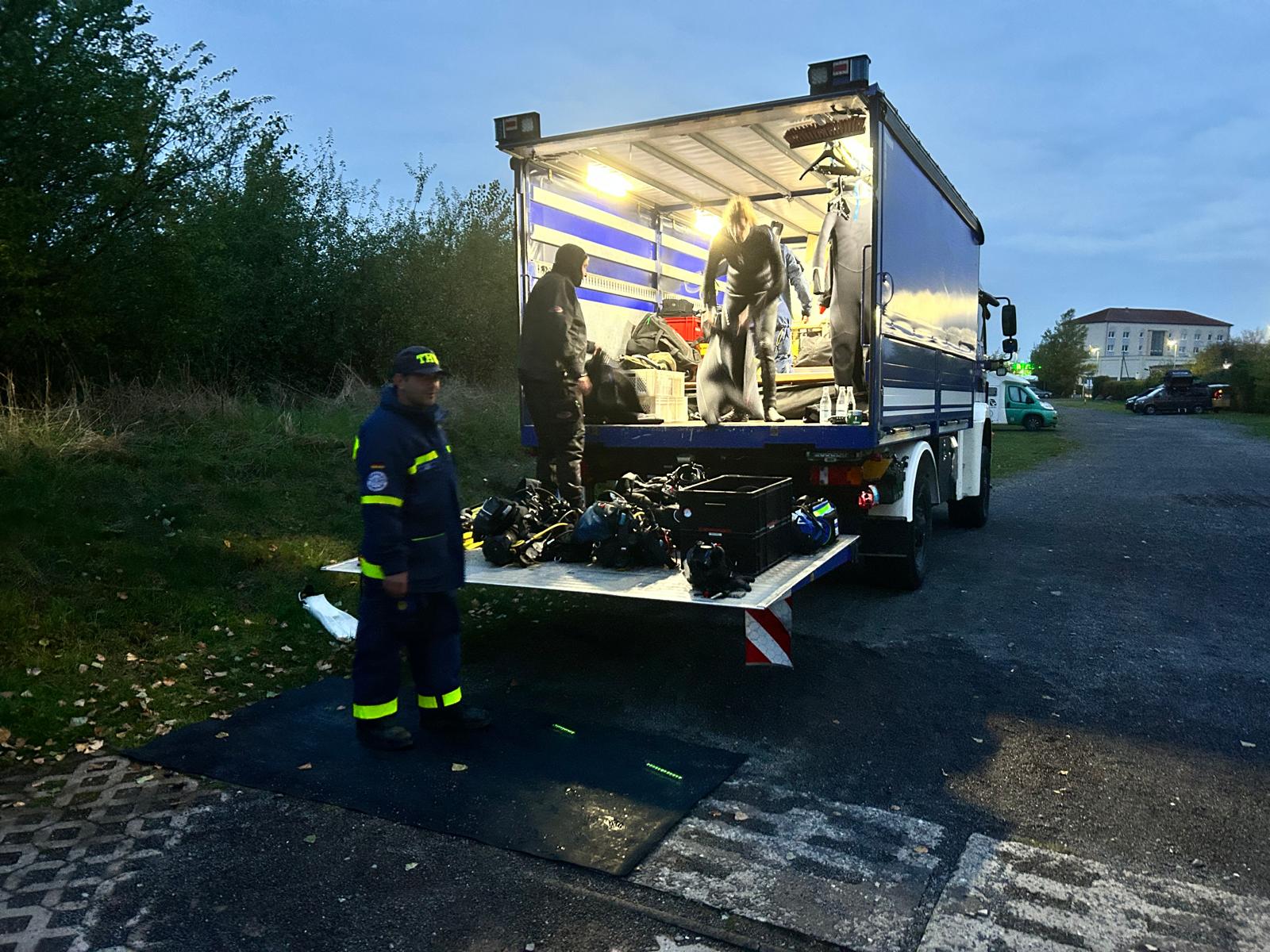 Neben den praktischen Übungen im Wasser wurden vor und nach den Tauchgängen tauchtheoretisches Wissen „an Land“ vermittelt. Zusätzlich gab es eine Praxis-Übung zur Sauerstoff-Gabe bei Tauchnotfällen. Beim gemeinsamen Essen und Zusammensitzen kam auch die Kameradschaftspflege und der Austausch von gesammelten Erfahrungen nicht zu kurz. Dabei wurde auch der nun anstehende Ausbau der Ladefläche des kürzlich übernommenen MLW4 in Bezug auf die tauchtechnischen Belange im THW Bergungstauchen erörtert.